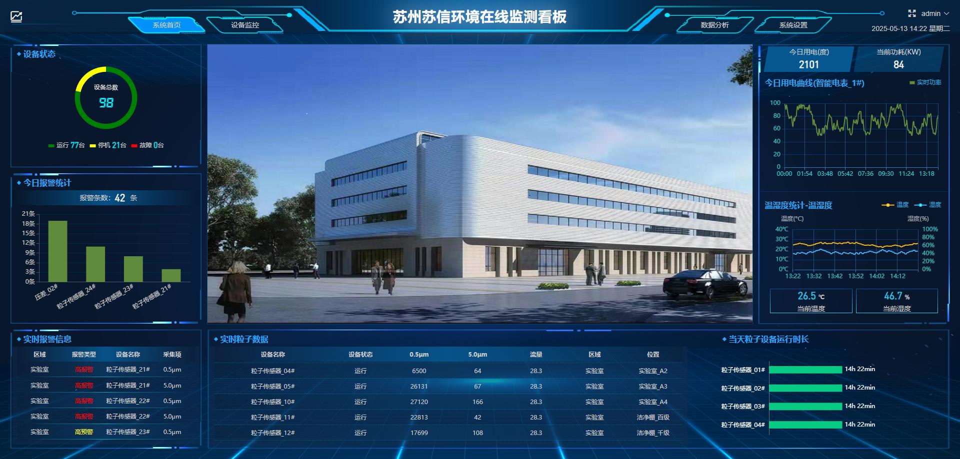 感知层:部署激光粒子计数器(0.3μm/0.5μm/1μm /5μm)、温湿度传感器、压差传感器、露点传感器;