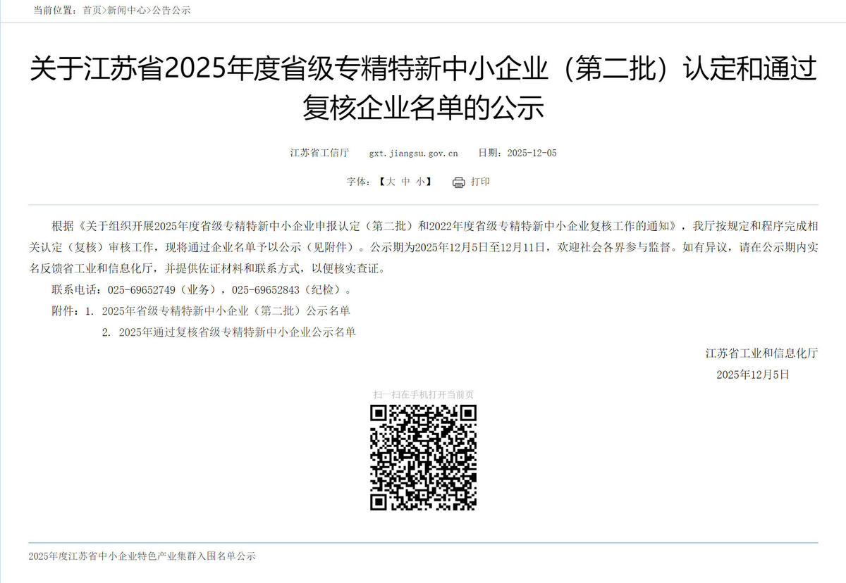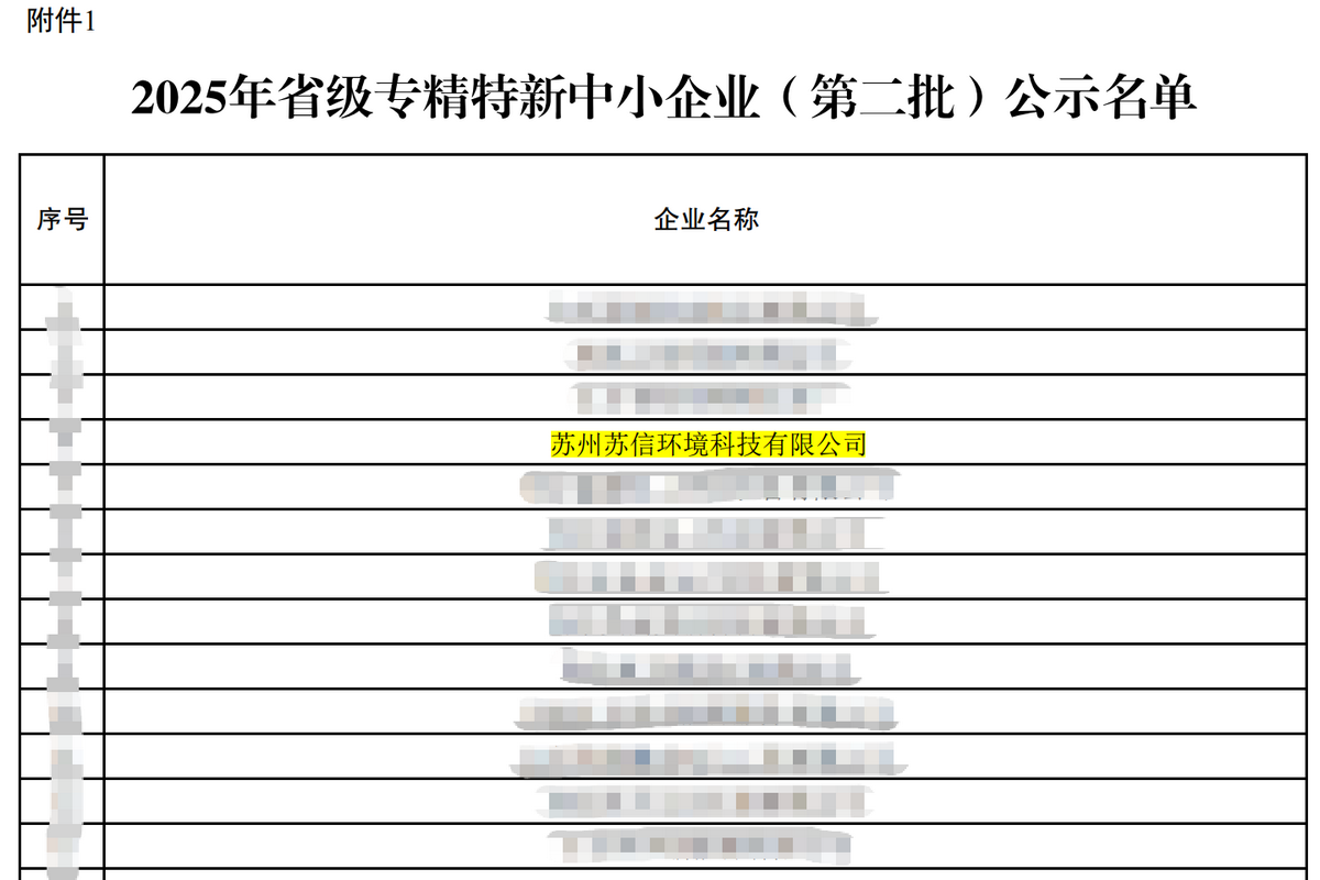 近日,江苏省工业和信息化厅正式发布《关于江苏省2025年度省级专精特新中小企业(第二批)认定和通过复核企业名单的公示》。经过层层筛选与严格评审,苏州苏信环境科技有限公司凭借卓越的创新实力与扎实的市场表现,成功跻身省级“专精特新”中小企业行列!
