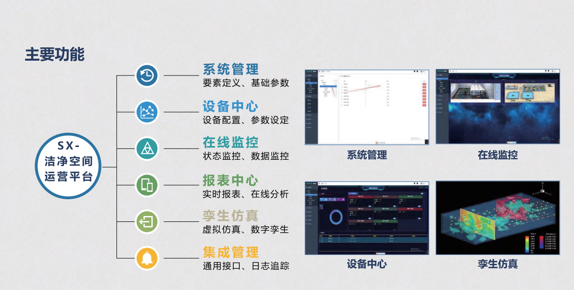 苏信自主开发的线上洁净空间运营平台,可实现对洁净室内设备的的集成与集中管理,可根据客户需求设定设备配置以及参数设定,可实施24小时的状态监控和数据监控,并可实现实时报表和在线分析。在节省人力的同时,降低洁净室被污染的风险。