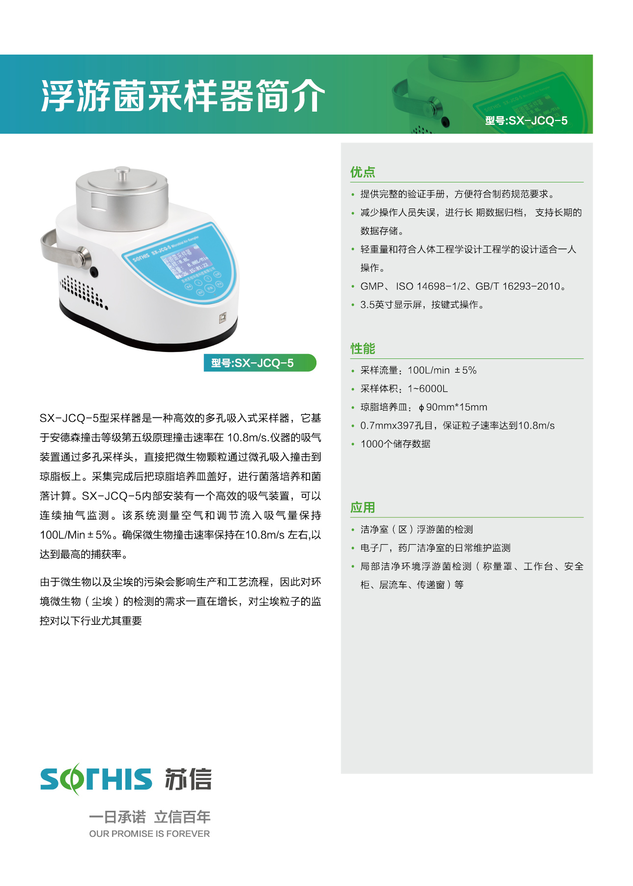 SX-JCQ-5型采样器是一种高效的多孔吸入式采样器,它基于安德森撞击等级第五级原理撞击速率在 10.8m/s.仪器的吸气装置通过多孔采样头,直接把微生物颗粒通过微孔吸入撞击到琼脂板上。