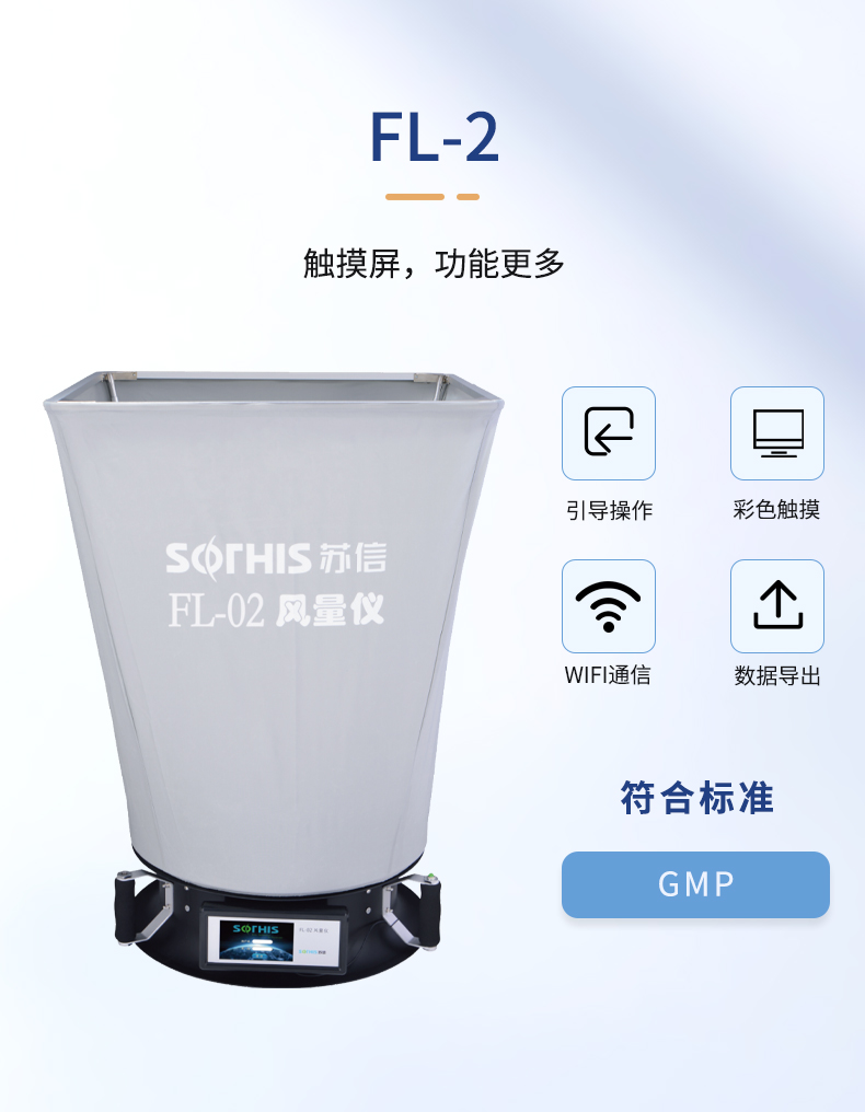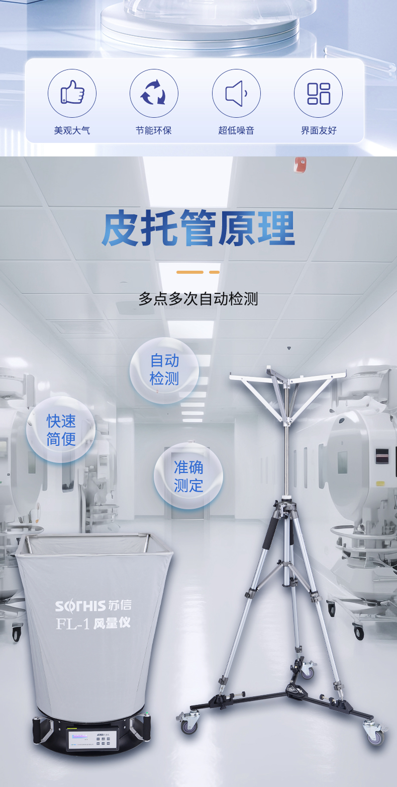 FL系列风量仪对洁净室送风风量进行精确测量,对洁净室换气次数提供准确数据,送风风量、风速是洁净室换气次数的主要项目之一。其采用皮托管原理,对风压进行多点、多次自动检测,自动计算风量、风速同时呈现。触摸屏人机交互,方便操作。