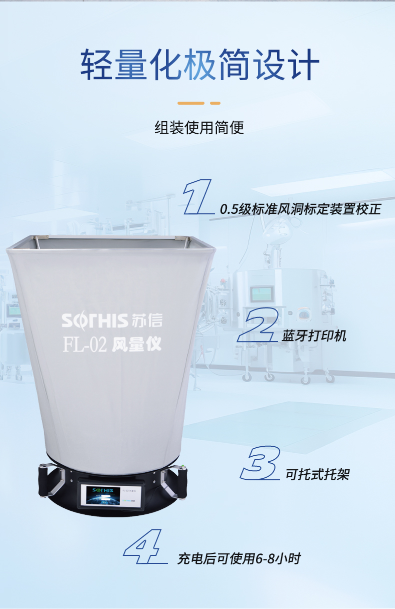 FL系列风量仪可直接用于测定风口和管道风量,测量快速简便,广泛应用于暖通空调、净化技术等行业。为方便客户现场检测工作,专门配备了移动式支架,测量高度可升至3.2m(含风量仪本体1m)。我司根据国外同类产品的先进技术,在国内率先推出国产化风量仪,每一台风量仪的出厂都通过严格的0.5级标准风洞标定装置进行多点风量校正,为用户准确测定风量提供可靠的质量保证。